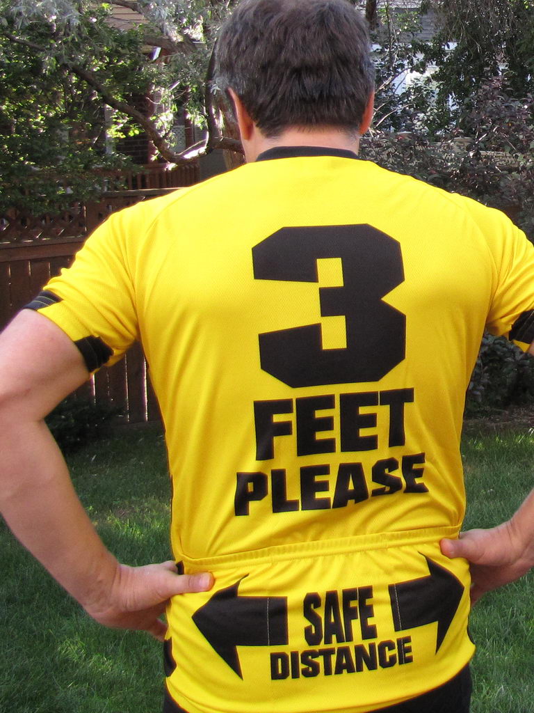 Unfortunately the UK based campaign (at http://3feetplease.org.uk/) sells pink buttons which I would definitely NOT wear, rather than the very sensible bike tops of our American cousins. Their web site is at http://www.3feetplease.com/ This web site is well worth a visit to see how successful their campaigning has been in just a few short years.