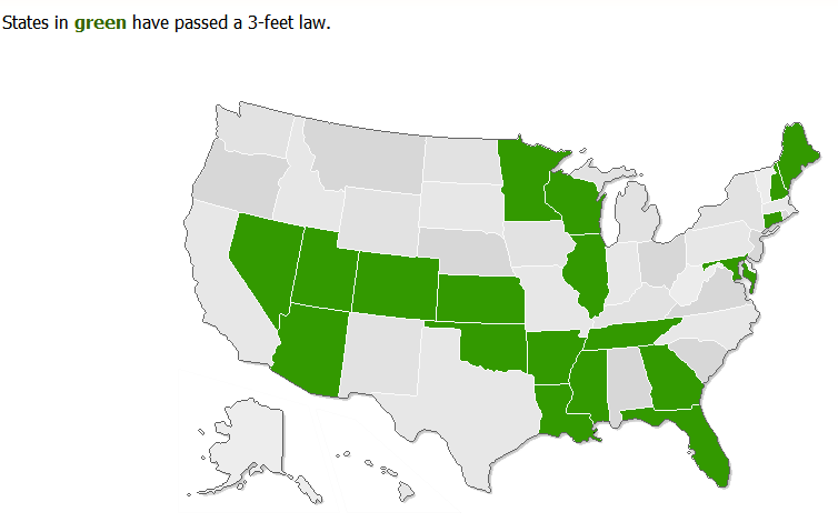 The 3 Feet Please Campaign was started in the U.S in about 2008 and has really taken off, not only with cyclists, but now also with state legislatures. Nineteen states in the U.S have passed laws which require motor vehicles to allow a minimum of 3 ft clearance when passing cyclists. And Safe-Passing bills are currently on the table in several more states.