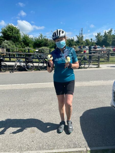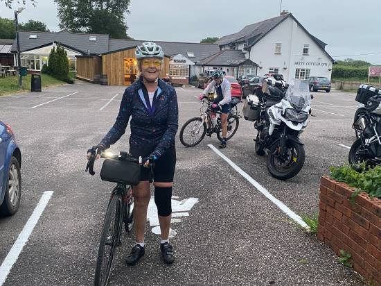 Then 30 flat miles along the water’s edge in glorious sunshine with an ice-cream stop. By the time we’d come to the end of the Tarka Trail and I’d reassured the others that we were not going back via Woolacombe, they were all expecting an easy cross country nip back to Ilfracombe. A rude awakening when we took a left turn off the trail onto what looked like a vertical road. Absolutely no chance of riding up so we had to walk. I was sure the top was in sight and indeed it started to ease off enough to get back on the bikes so off we went again until the next bend and the next and the one after. 5 miles of hill all the way (around 16%). We were so grateful to finally arrive back at the Fortescue Arms and the comfort of our cars. After a quick change and a cup of tea with plenty of banter from the pub landlord, we took to the road for the 5 hour drive home. The drivers – Jo and Carmen must have been exhausted, in hindsight it may have been better to stay an extra night.