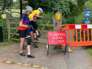 After quick debate we decided to go under the tape as there was no one around and continued on our way for a few more undisturbed miles. Then we heard chain saws and had to skirt round a lorry. The tree fellers were working down the bank below us so we figured we could creep by undetected. Not to be and we were caught by a very angry man who gave us a good telling off and told us we’d have to scale the closed gates another mile along the track. Apologising profusely, we made our exit and headed for the gates. It made quite a photo trying to help little Sandy clamber over the 5 bar gate!