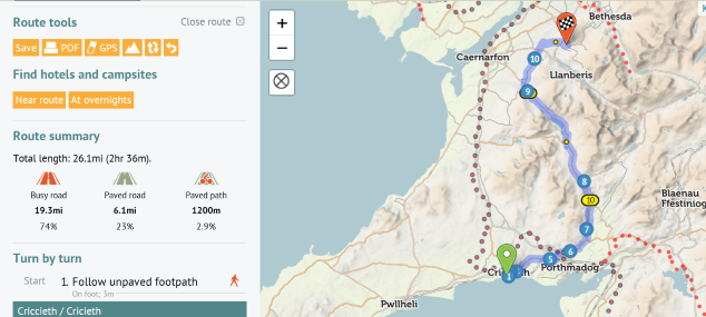 The full route from Criccieth to our B&B is 26 miles by road, or about 28 miles if you decide to take the gravel ride option via Lon Gwyrfai.