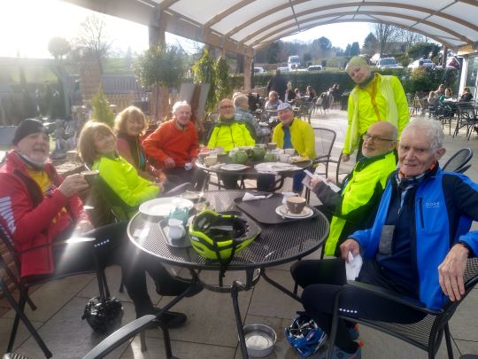 Just to add a bit of variation and to complete a figure of 8, we returned back to Priory Park Farm via Hogs Trough Lane. And this is us feeding our faces, like hogs at the trough, with a well deserved cuppa and enjoyable, social chat!