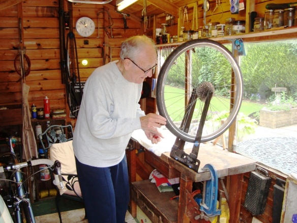 So a quick phone call to John, and he was only too pleased to get his hands dirty and to weave his magic on my wobbly wheel. And in less time than it has taken to type these words it was done. This is the master at work.