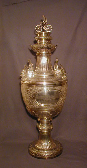 The most valuable of the Anerley trophies was the Carwardine Cup which was awarded to the winner of a 100 mile race held annually at Herne Hill cycle track..  The cup was donated to our club in 1895 by a Vice  President whose name was surprisingly – Carwardine!  It was not just a cup but a huge cup, valued at the enormous sum for those days, of 300 guineas. And huge it was, standing 4 foot 10 inches tall, and made from 650 ozs of silver, with ornamentation of solid gold.