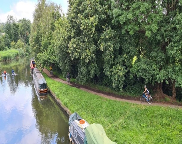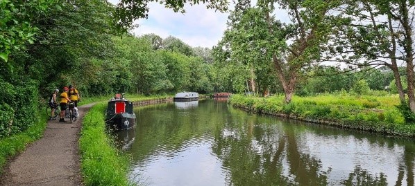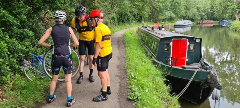 The Wandle Trail looked lush and green as we meandered Northwards, we skirted around the North of Wimbledon and arrived at Wimbledon Village. My offer of a look at the tennis was politely declined by all, so onto and through Wimbledon Common, initially taking the group the wrong way, Roehampton and into Richmond Park. Part way around the park on the Tamsin Trail before exiting Northwards into East Sheen followed by Mortlake and then The River Thames. This we followed until we crossed Kew Bridge and turned Westward along the side and below the elevated M4. We crossed the M4 via a nearby elevated walkway and returned to the required junction. Led the group up into a dead-end before turning and accessing the Grand Union Canal. We travelled along the towpath until deciding we deserved a coffee stop. Cafe selected and we secured bikes, ordered coffee, used facilities, discreetly scoffed our own foodstuffs etc and waited and waited for our never to arrive coffee. On departing, we went off route and got Monica and Geraldine safely to Southall train station where we said our goodbyes. Now we were just 3. Back to the canal and West we went. It quickly became apparent that our smaller group although chatty was very much less chatty! A few miles further along the mixed surfaces (some brand new, some definitely not) of the towpath, right at the edge of the water and we turned left onto the Grand Union Canal – Slough Arm. Forgot to mention that at 1 point we went uphill over about half a mile, passing lock after lock after lock (are there 13 of them?). Impressive. Plenty of life on the canal as well. Enviable lifestyle. About halfway along the Slough Arm and John suffered a puncture on his rear wheel caused by a discarded ink pen cartridge. He had only put these tyres on, brand new the day before. One text book puncture repair later and on putting the wheel back and testing it found that the ink cartridge had affected his brakes and mudguard as well. Whilst trying to assist / not get in the way Alison and I managed to scoff some food and drink. Before we knew it our turnoff appeared and we left the quietness of the canal and headed South to Windsor and our first proper coffee stop.