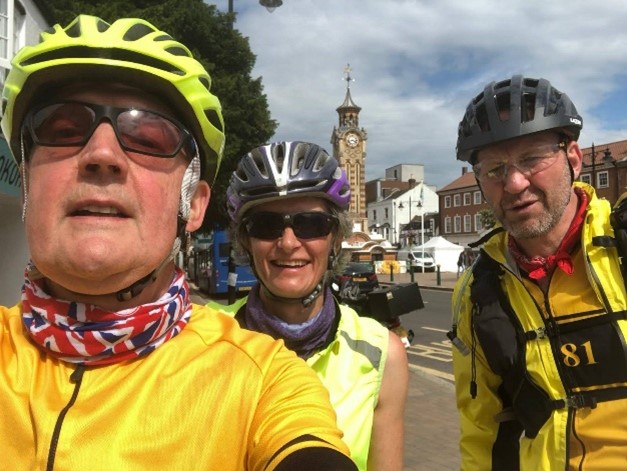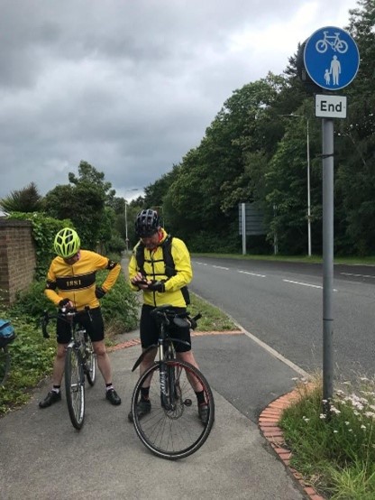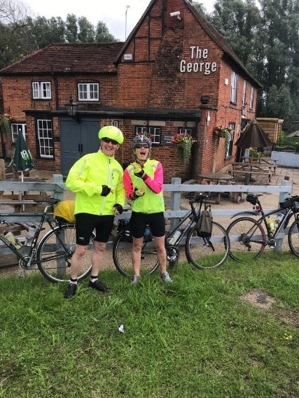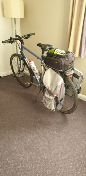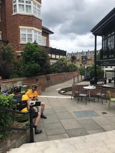 On the outskirts of Reading light rain started to fall gradually getting more persistent  as we went. Jackets on and we arrived in roughly the centre of the city. The area being Caversham. John left us and crossed the river towards his bed for the night. Alison and I travelled further along to Alison’s intended hotel, only to discover it was fully booked. The more upmarket hotel next door was only too happy to take Alison’s money. Arrived at my sisters at 8pm, showered, gear washed, chicken and chips followed by delicious homemade rhubarb sponge and chilled ale, quick catch up and bed.