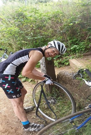 I have tried to give a light hearted comment on everyone involved on the day. Well what can I say about Fran? She was a trooper. From start to finish I saw nothing but smiles, even when confronted with Vinces banter. There was a point thou’ when she took a tumble on a sandy trail section that the smile dipped slightly, but only momentarily, dusted down, back on the bike and smiling again.