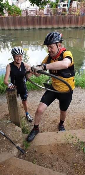 Within minutes we had the first of 2 punctures and in her excitement of participating, Geraldine had left her repair kit at home. On the 2nd puncture Shak came up trumps with a suitable replacement inner tube. Both punctures where quickly and cheerfully dealt with.