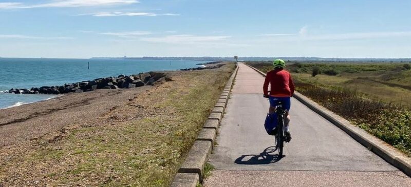 So here we all are, on the sea front at the start of our ride. 7 of us, left to right – Jo Rifaat, me, Tom Moody, Jo Smith, Asif, Tom Vaz, Sue Smith, plus Denise at number 8 who was taking the photo. And note the blue sky! No wonder we are all smiling.