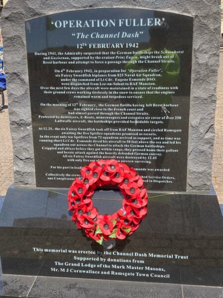 Little known, but another act of wartime heroism is this memorial beside the harbour. It relates how the crew of 6 aircraft took off from Ramsgate to attack a heavily armed German battle fleet in the Dover Straits. All 6 planes were shot to pieces. Of the 18 airmen, only 5 survived to be rescued from the cold waters of the English Channel.