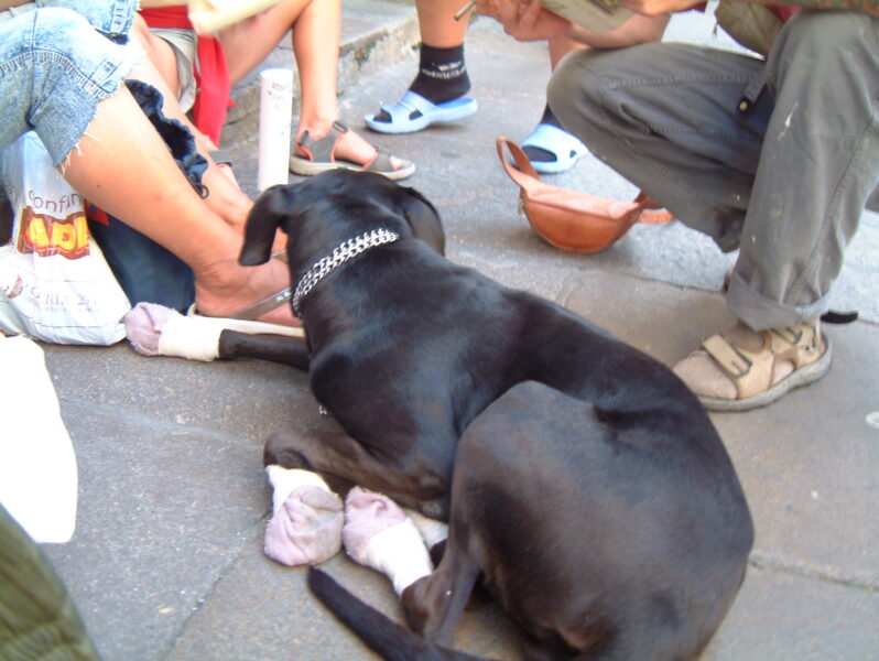 Next morning the hikers were up very early, before the sun made the tarmac too hot for walking. Tired feet were shod in sandals, not boots. Even their dogs wore suitable paw wear!
