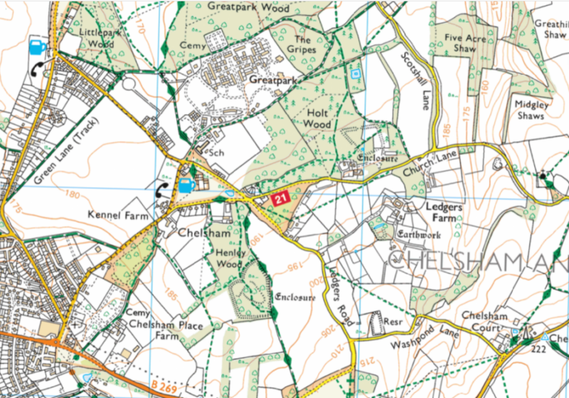 In Part 1 we had got to the Trig point by Chelsham Court Farm and were about to go down Washpond Lane, at bottom right of the map section below. To give you some idea of where this area is, look at the red road, bottom left, which is identified as the B 269. To us it is better known as the Limpsfield Rd. Heading to the left on the B269, you will see the built up area of Warlingham, and the green square on the north side of the road, is the Sainsbury supermarket. And to the right of Sainsbury is the + sign indicating the Church. Heading to the right from Sainsbury along the red road (B269) would take you back up the hill to Botley Hill Farm.