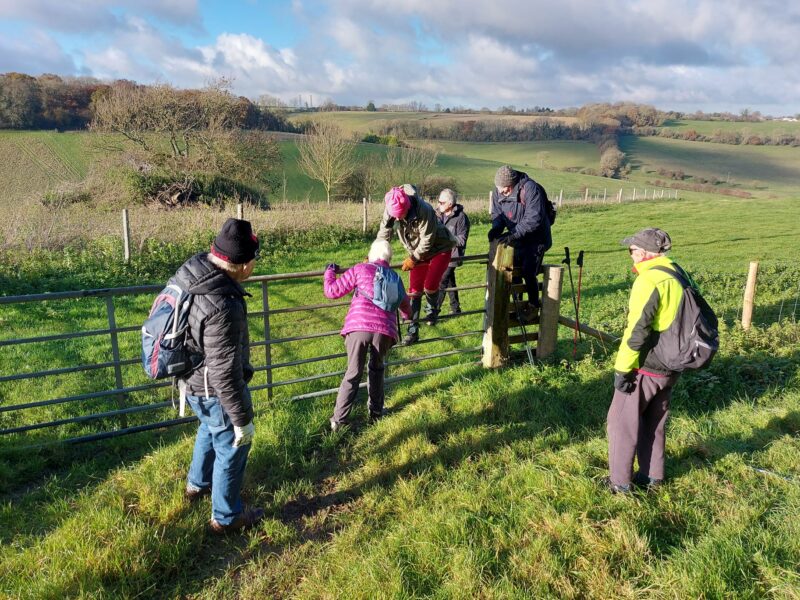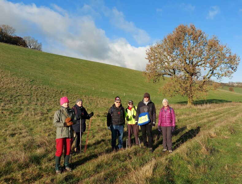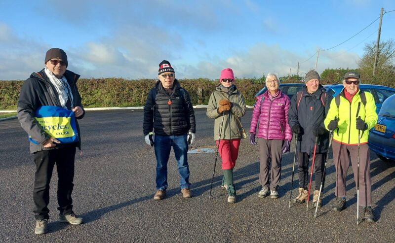 I hate cold weather and don’t enjoy cycling when the mercury drops to zero. For me, the enjoyable answer is a winter hike – a change from cycling, and the opportunity to see country vistas and so much more, when not having to look out for the myriad potholes on our roads and country lanes. So I advertised an Anerley Hike on the Ride Register and ended up with the the six shown below – plus Asif who took this photo of us meeting up at Botley Hill Farm. And note the blue sky!