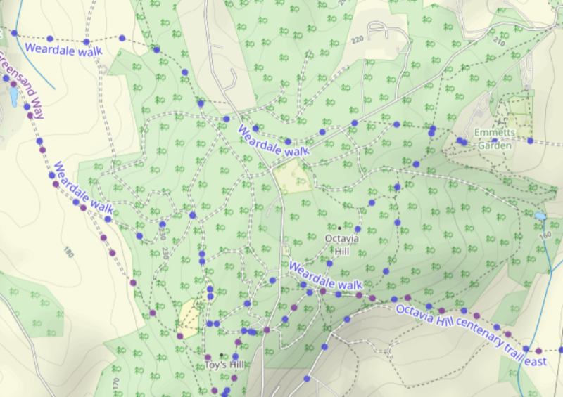 For example, below is a small section of a Michelin “Outdoors” map section, covering an area which includes Emmetts Gardens and Ide Hill at top right, and Toys Hill at centre bottom.