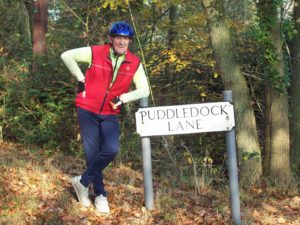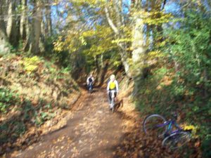 Further on the lane starts a steep descent, made tricky by fallen, wet leaves and a rock strewn road surface. The photo shows John Dadson and Sandra picking their careful way down this sunlit cutting. We were all glad when we reached the bottom and turned into the delightfully named Puddledock Lane!