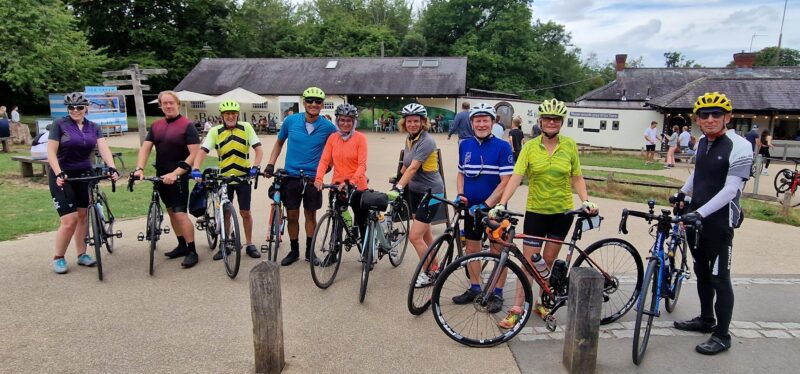 My first Autumn ride on Sunday 4th September was very well attended – 10 turned up for a ride out to the Vineries Garden Centre Coffee Shop at Effingham. Unfortunately we had a bad start for the first 7 of us setting off from Shurgard. We had only just got past the Tesco roundabout when “puncture” was called by Julie, so we all pulled in off the road.
