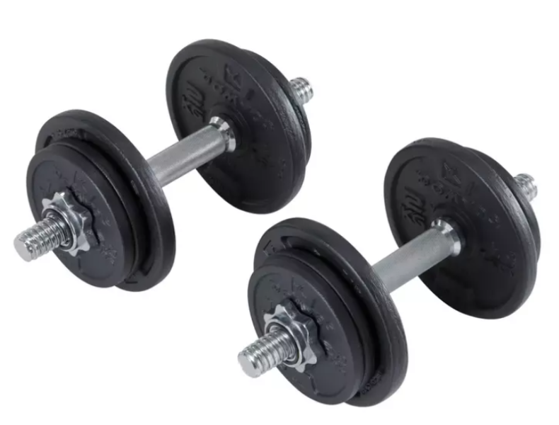 DUMBBELLS. You can get a good starters set for £50 from Croydon’s Decathlon. These again are a lot cheaper, more convenient and time saving, than going to the gym. This dumbbell set comes in a carrying case for handy storage at home, and separate discs are available to increase weight as you get stronger.