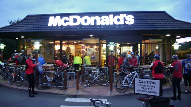 The forecast was diabolical. The actuality was very different. It was almost balmy as we set off up the Edgware Road and the A5 out of London. The sophistication of Maida Vale translates through retail parks to surburbia and, all of a sudden becomes a country lane. Combined with a strong tailwind progress was fast and easy. Passed St Albans it again becomes the fast A5. Dunstable was rockin’ as we sped through to our early hour refreshment at a 24 hour MaccyD and a magnificent dawn – the real bonus of night riding.