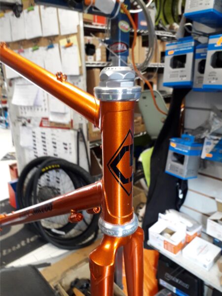 I also ordered some Brooks bar tape in brown. I ordered custom bar ends from Kapz with Sunseeker written on them – they where fairly dear but they look really good. I had to get some STI adjustment barrels for the frame in orange. Lastly I went through two sets of wheel alignment screws – have you ever tried to screw the end cap onto a screw with a spring? It’s so hard to do – I still have three missing caps in the kitchen somewhere. I was looking at getting some old style tyres but just in time Perilli launched a classic version of my favourite tyre the P Zero.