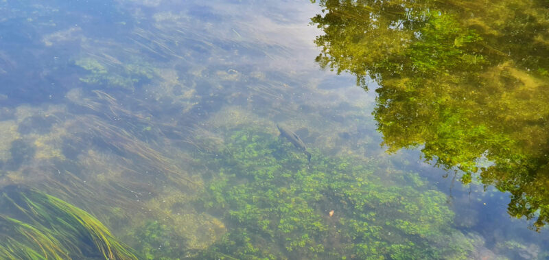 First impressions are of a clear stream where the trout can be seen enjoying the flow under a bridge.