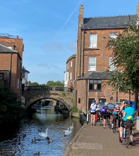We took the foot ferry across the river at Walton to our first stop at The Ferry Coffee Shop, Shepperton, which did delicious iced peach tea (and a quick repair to Denise’s light bracket!) We then headed near Virginia Water (closed to cyclists), Ascot and eventually Aldermaston where we joined the Kennet & Avon canal path. Access to the tow path is via this road over the lifting bridge!