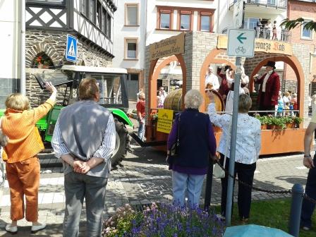 After Piesporter wine, the next most famous place for wine on the Mosel is Zell. It’s local wine is named “Schwarze Katz”, in English “Black Cat”. When we arrived at Zell it was festival time and the road thru the town was closed for the carnival floats. All of course decked out with wine themes. Here a rather large bunch of grapes!