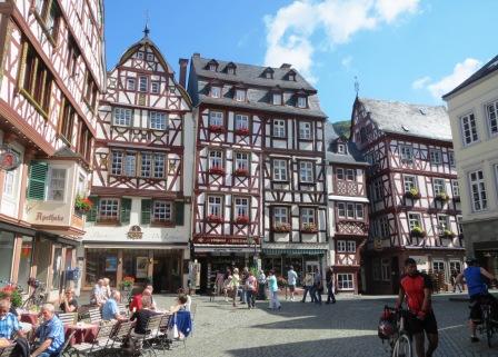 On day 3 we left Brauneburg, and after a short bike ride of only 8k /5 miles we arrived at Bernkastel. Its town charter dates back to 1291 but excavations show evidence of habitation back to at least 3000 B.C. The Romans were here for about 500 years and the staple diet of the Roman Legions was wine and bread. It was the Romans who introduced the vine to the Mosel region to provide the necessary wine for their troops, rather than transport it all the way from Italy. In later years the production and trade in wine lead to the growth and importance of Bernkastel. The town centre has many historic buildings, the oldest dated 1491.