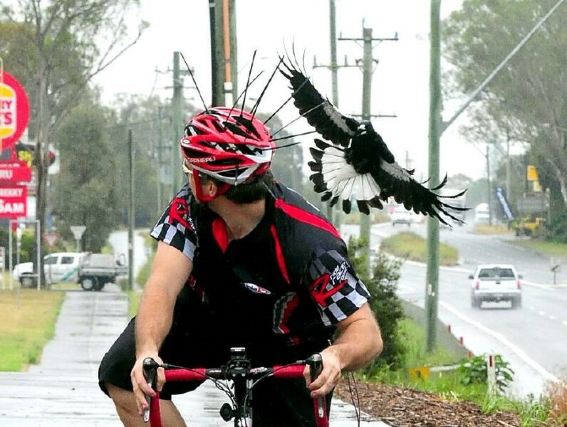 I soon discovered that you cannot out cycle them. They can match your speed with ease. As instructed, I carried a small pump in my back pocket which I waved around my head furiously as a deterrent.  Although the magpies can cause minor injuries, the main danger I found was that the attacks completely took my mind off the road. Wobbling around with one hand on the handle bars, trying to look back and upwards whilst still considering traffic, pedestrians and road furniture was all but impossible. This is the problem! [Magpie Attacks Cyclist in Australia 😱😱😱 – Bing video].