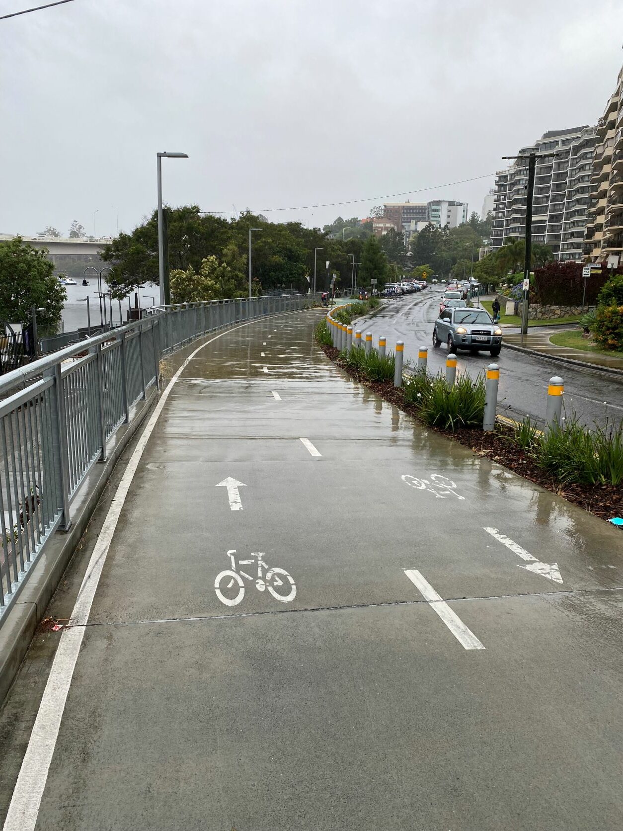 The first ride we planned was called the River Loop which is almost entirely on purpose built cycle paths and does what it says on the tin – loops along the River Brisbane. We had arranged to meet up with an old colleague of mine, Adrian, who emigrated to Australia 18 years ago. We were up at 5am to be met by drizzly grey weather. Martin greeted me with a tea and said “Your mate won’t turn up in this!” as he glanced out at the gloom outside. “No, he will,” I insisted. Reluctantly Martin agreed to ride and we were soon at the Botanical Gardens, the agreed meeting point for my friend. No show. After a couple of messages, it transpired that he had seen the weather and thought no one would cycle in these conditions. He had become a true Aussie! To be honest, when most days are sunny and dry, you can afford to skip the wet ones and keep your bike nice and clean! We continued with the ride and enjoyed the amazing cycling infrastructure – cycle paths the size of roads built on stilts above the river and purpose-built cycling bridges over the river that were completely separated from the busy traffic on the roads. Brilliant! Very popular with walkers, runners and cyclists although maybe a little less so on this particular morning. As we continued it got a little wetter. Luckily, I had a light weight jacket but Martin was pretty wet and cold by the time we finished. As he left for work, he suggested I might like to clean the bikes. Recompense, I guess.