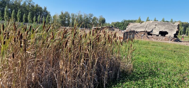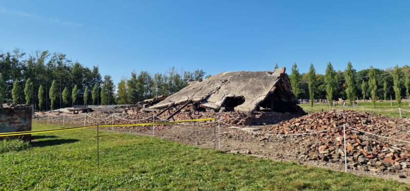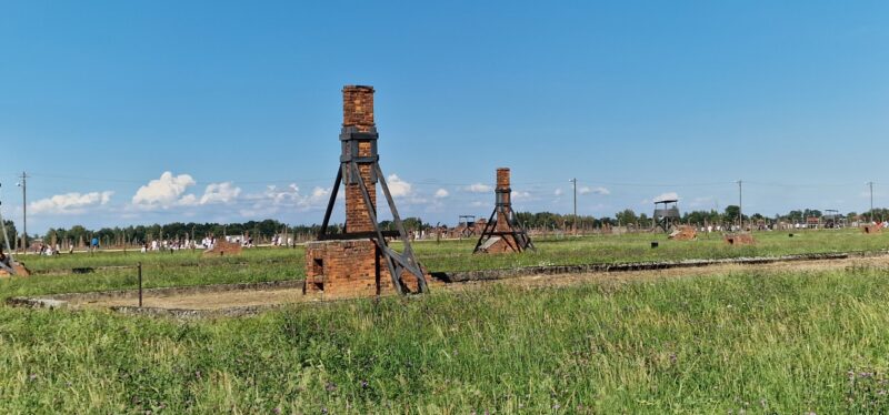 After a couple of hours in Auschwitz 1 we got on a bus to Auschwitz Birkenau or Aushchwitz 2. Here is where you find see the scale of the industrialised extermination that was going on. Starting from the train line it was turn left to go to the work camp or turn right to go straight to a gas chamber. The only part of the wooden huts are the chimneys – after the war, any timber was taken by locals for firewood or reused elsewhere.