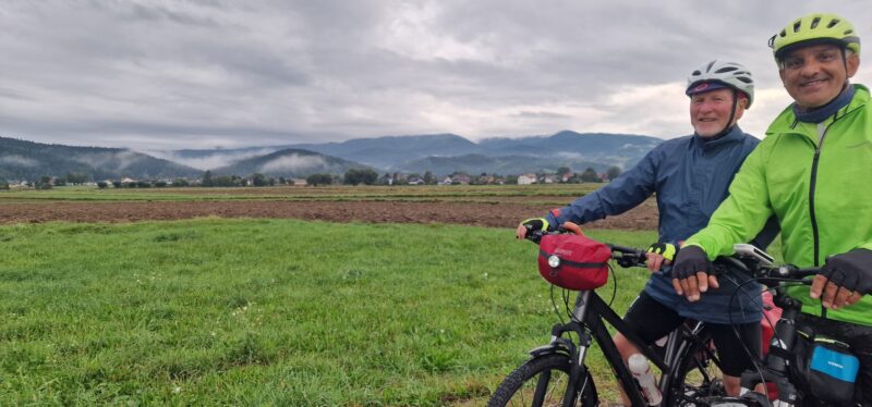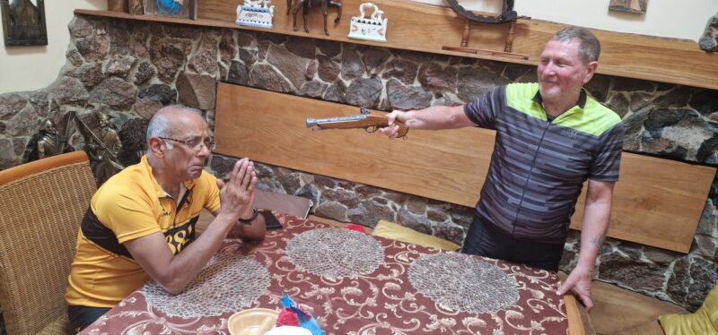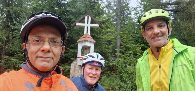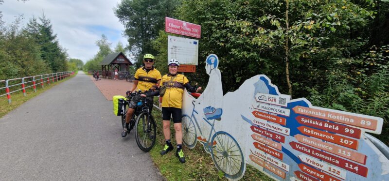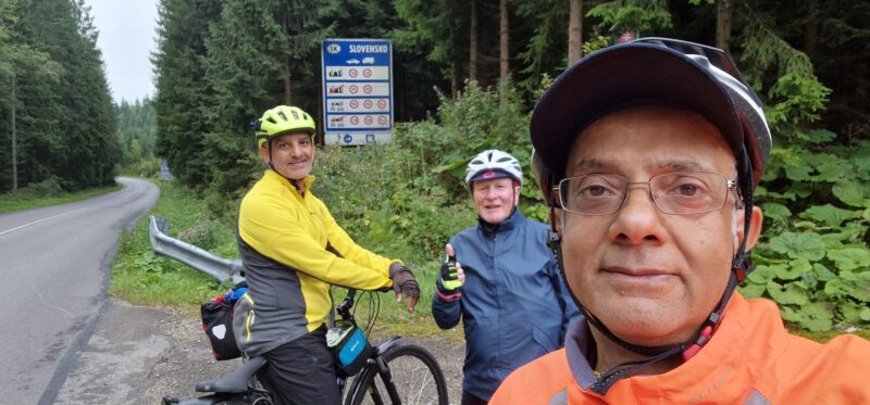 This was a tough day’s cycling. I haven’t mentioned, until now, each day started with a visit to a local supermarket to stock up on snacks (peanuts or snickers) and something for lunch, usually bread or croissants and some fruit. Asif also had to buy bottles of sugar loaded orange juice because of his diabetes. Well, it was all needed as we headed into proper mountain territory with a steady climb along a stream and a forest road up into Slovakia.