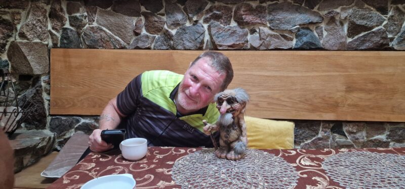 As we cycled through a short section in a forest, we were accompanied by a friendly Polish man who told us that he had taken photos of us as he was putting together the publicity for cycling around the Malopolska Region which srurrounds Krakow etc – basically, where we had been. After telling us that we may be made famous by his article, he left us to visit a local bike pannier company and we continued on towards a lunch stop. Nothing promising appeared until, in the end, we just stopped at a Zabka Cafe – essentially a takeaway food counter in a mini-market. Hot coffee and a panini seemed like good value even though the nutritional benefits were dubious.