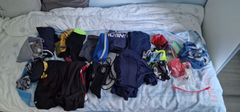 We flew with Easyjet each of us checking in one pannier and carrying a lighter pannier as hand luggage at a cost of roughly £200 each. All accomodation was pre-booked with booking.com. For reference, this is what I took with me…