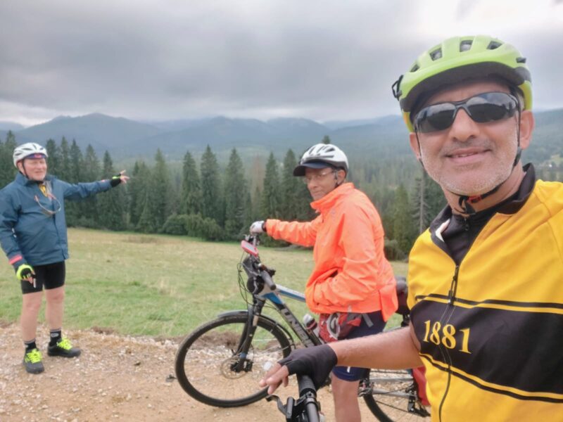 It’s a good idea to have a day off the bike at the half way stage and our chosen day comprised a 10 mile hike in the Tatra Mountains. The entrance to the park was a very short distance from our apartment through luck more than careful planning on my part. However, during the previous evening, I received an Emergency SMS message from the Polish Mountain service warning of heavy thunder storms and to avoid the mountains. We contacted Ewa, originally from Poland and club member who happened to be in Poland at the time. Ewa, somewhat unhelpfully said,”They send these messages a lot and they aren’t always right. It’s up to you. you can always buy some second hand mountain clothes in townand throw them away afterwards.”
