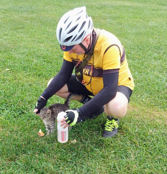 We skirted around Trstena where we caught a 7 mile long, tarmaced, cycle path which took us over the border back into Poland. Along the way, we found a picnic spot with a water fountain where we had a snack. TomTom decided to share his with a cat!