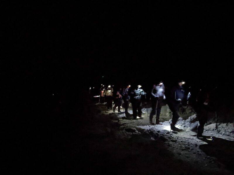 The task was to climb just over 1000m (equivalent to Snowdon( in the dark with just our head torches for light.  It was expected to take around  6-8 hours. It’s fair to say that we struggled big time. We inched our way up.  Every now and then I would look up and see a chain of lights winding their way up like some weird Christmas tree. Strangely I didn’t find it demoralising to see how far there was to go.  The lights were mesmerising and drew me on.