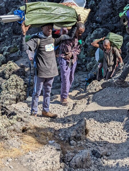 Porters – who carried everything from one camp to the next.  And I mean everything.  Our main bags (up to 15kg each), the tents, tables, chairs, food, cooking equipment, gas, chemical toilets, sleeping mats, medical supplies…..and they went ahead of us so that camp was set up by the time we arrived every day.  They mainly carried things on their backs or their heads.  And while we were struggling to negotiate some aspects of the climb, they would whistle through almost effortlessly.  Absolutely stunning.