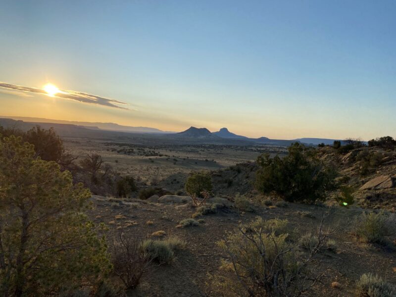 We wild camped in the forest for the first time and cooked 100 yards from our tent to avoid attracting animals. We woke at dawn to the sound of howling Coyotes. The track deteriorated as we tackled the last 5 miles of the climb and we were soon pushing our bikes over boulders. We were encouraged by the knowledge that once over the top there would be 37 miles of decent into Abiquiu. This optimism was soon shattered as the terrible track continued for the majority of the descent and meant painfully slow progress. We were averaging round 5 mph. Either slow jarring riding or awkward walking with the pedals inevitably banging into calves.