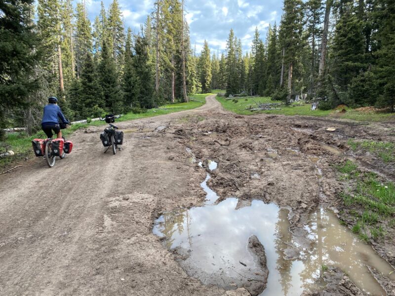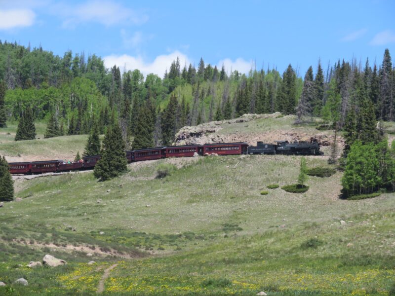 We descended by track to take lunch by a river just as steam train chugged across the opposite hillside on the Cumbres & Toltec Scenic Railway. Here we also saw the first southbound female racer, doggedly hugging the back wheel of a fellow competitor as they slogged up a long hill on the gravel. Shortly after we reached a tarmac’d road and we were in Colorado!