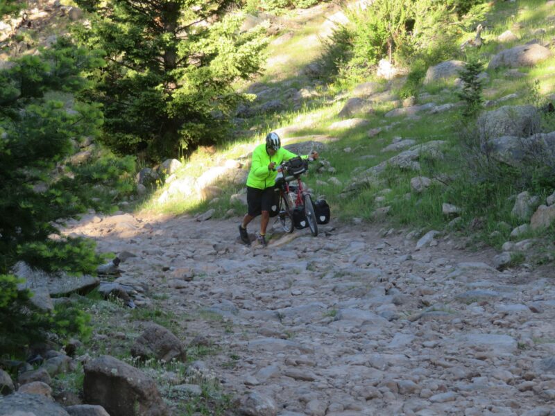 After leaving the lake the next 12 miles were particularly rough and took 5 hours of walking and only a few yards of cycling. In a couple of places our path was blocked by snow and fallen trees. We pushed on to reach 11000 ft for the first time and enjoyed a brew on the Brazo Ridge. A chance to recover from our shortness of breath