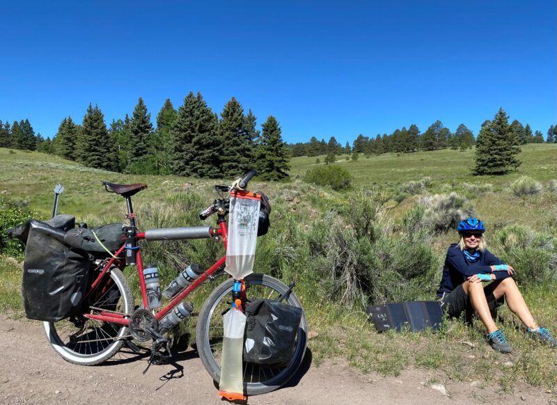 We met our first cowboy, a tall man wearing a Stetson hat, at the Germino Guest Ranch. We were hoping we could stay the night. The clue is in the name of the ranch; right?… Nope! At first, he was a bit grumpy and asked us what we wanted as he pulled up in a massive pick-up truck at the entrance to his ranch. He informed us that the ranch was only for guests on horse riding packages and was obviously a bit irritated by being bothered by cyclists. Sally complemented him on his beautiful horses and he softened a little and let us re-fill our water bottles from a ground water pipe. He was proud of how pure the water was and explained that his grandfather had established the ranch and that he was self-reliant – water/power/security (gun). As we left to pitch our tent on nearby public land he went to his truck and returned with an energy drink and bar for each of us.