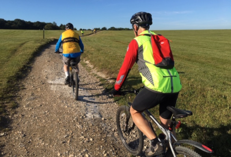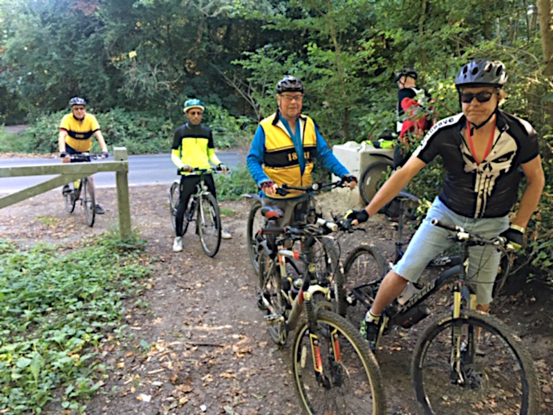 What a glorious day for a bike ride! Wall to wall blue skies and 25 degrees in the sunshine.Today was an off-road treat heading out to Tattenham Corner by train to get us straight onto off road trails across Epsom Downs. Peter R had dusted down his MTB for a rare outing and Chrys joined the Saturdays for the first time on his hybrid. Other riders were Bob, Roger and Mick.