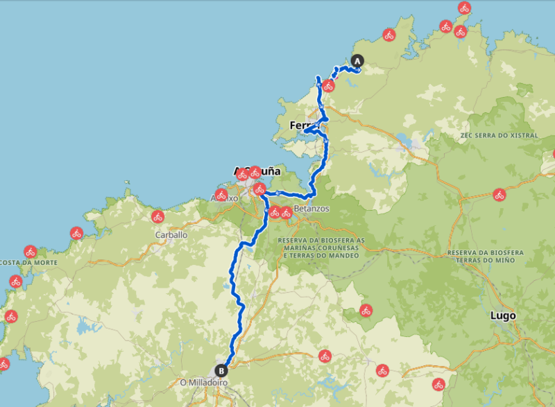 Leaving Ferrol wa not easy, after a struggle we eventually found the Camino signposted bridge across the estuary which led us onwards and over headlands and across another river to the final headland leading onto Coruna. Some careful navigating was required to make sure we didn’t end up on a busy main road into the City centre where our hotel was located – actually a very nice hotel! From here we made our enquiries about the final bus journey from Santiago de Compostela back to Santander and purchased special bags for our bikes to put into the bus hold. I had reserved the bus tickets for us and our bikes online so I knew we needed to get the bags and with an early start at Santiago, didn’t want any pfaffing around searching for these “special bags”!