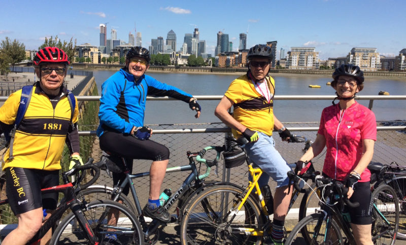 Just before Catford the Pool River flows into the Ravensbourne. We crossed the railway via a high spiral bridge with a convenient slope to cycle up and down, although we were thwarted by dog walkers coming the other way! We followed the Ravensbourne through Ladywell Park and the Ravensbourne Mill Park to reach Deptford and the Thames. We had great views across the Thames to the city skyline and up the river to the Shard.