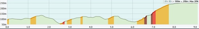 After a few hundred yards we joined the B4066 and a few easy undulations. After less than a mile we hit the first noticeable step of the ladder – Stinchcombe Hill. Then a nice downhill followed by the next big step (starting at blue No. 1 on the map) – a short very steep bit right at the start, but the hill continues going up until we arrived at the little village of North Nibley.