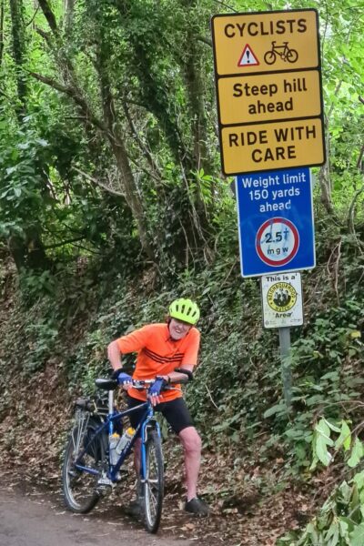But getting back to our bike ride. It was at this point at the top of York Hill that the heavens opened – hence Delmar’s natty white jacket! Fortunately at this point our road continued through thick woodland which provided good cover from the rain. So we continued on and after right turn came to Bayley’s Hill, which truly is a hill!