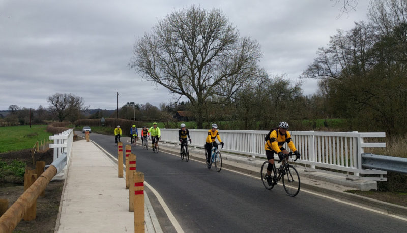 A stiff ascent of Portnalls and descent of Reigate Hill got the blood circulating. And then “The Crossing of the River Mole”. Not re-built in Kwai conditions nor timescale, the bridge that was swept away in the disastrous floods of 2015(?) has, at long last been re-opened. We sped across triumphantly perhaps regretting it had little of the charm of its predecessor …