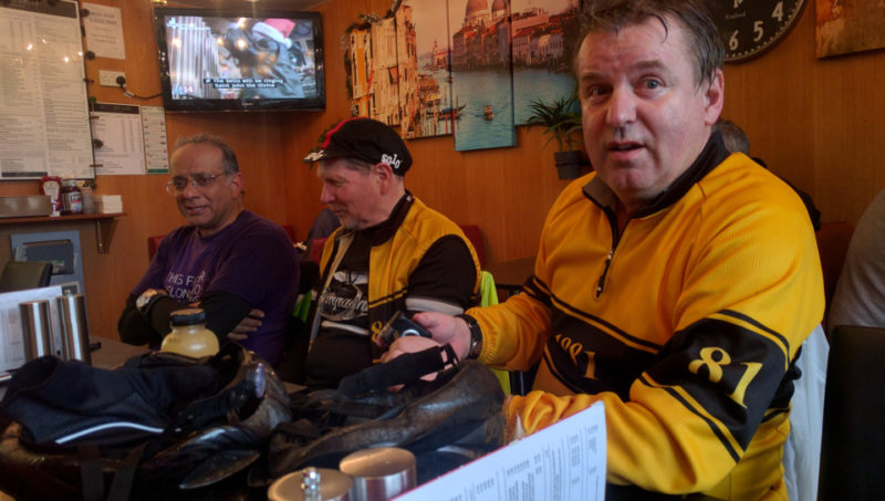 After a brief interlude allowed for cursing and cleaning mud off bikes we onwards. Frank was on his usual curfew so here is where he left us as we gingerly negotiated Chalkpit Lane to Oxted and then towards Lingfield via Crowhurst. All the while the rain got stronger. After the first downpours washed our bikes clean the joy that the unforecast rain brought rapidly disappeared. At Crowhurst Jim decided to head home and the rest of us limped into Lingfield like the Spanish Armada before receiving the greetings at the Red Rum Cafe reserved for drowning rats.