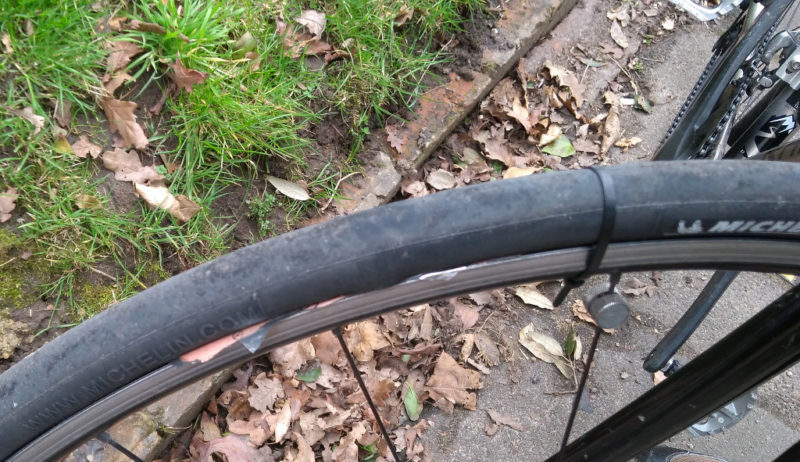 A packet of Walker crisps, flavour unknown, was serving as a tyre boot [you can just see the edge of the packet poking out]. And a cable tie was holding everything together. Ingenious! Though this fix is more appropriate to disc brake wheels than rim brakes. This meant TomTom & Tom played safe and headed for the nearest train station and home.