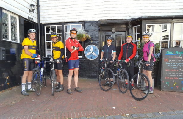 After 53 miles we ate lunch at the Smugglers Inn at Alfriston (slow service considering we mostly just had chips). The change of lunch venue brought on by Tomtom’s desire to see an old CTC wheel logo. It was a really decent place to sit in the sunlit garden while I ate my illicit sandwich. A traffic jam in Alfriston forced us to take a footpath across the river and fields onto the other side of the valley before we